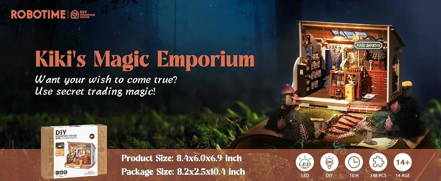 【Kiki's Magic Emporium】 - Step into a world of enchantment with this 1/20 scale mini dollhouse. Featuring broomsticks, magic books, crystal balls, Pharaoh's eyes, magic potions, and more, this kit from the Mystic Archives Series is a wonderful arts and crafts project for kids and adults alike.