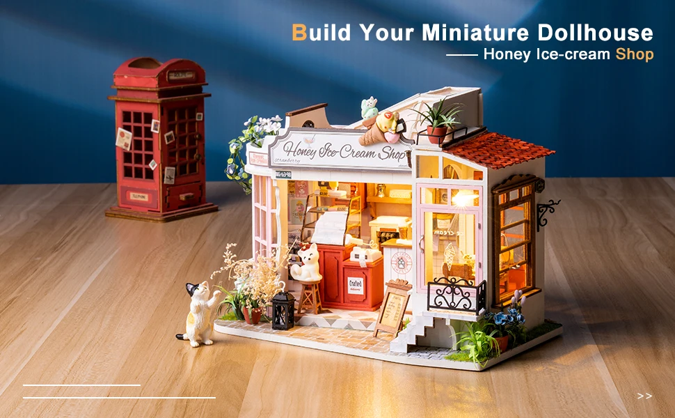ROBOTIME Dollhouse Miniature with LED Wooden Miniature Craft Kits for Adults DIY Model Ice-cream Shop Kits Creative Gift