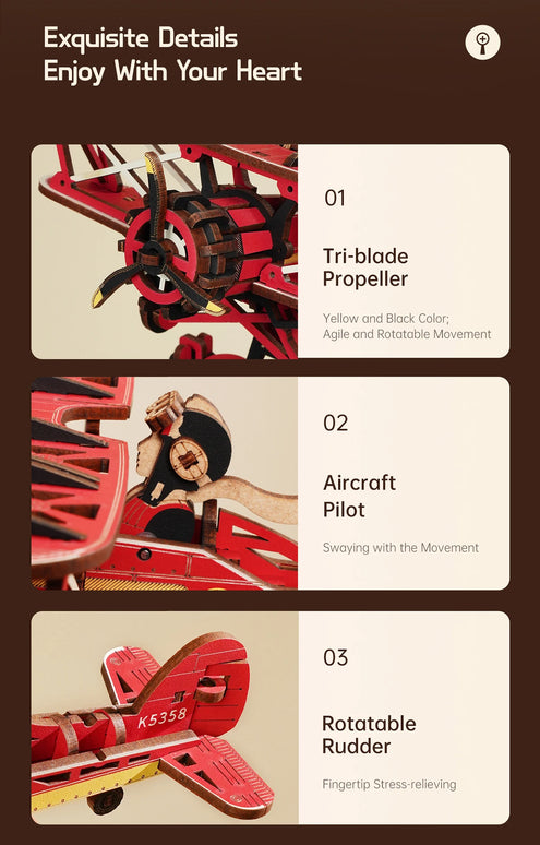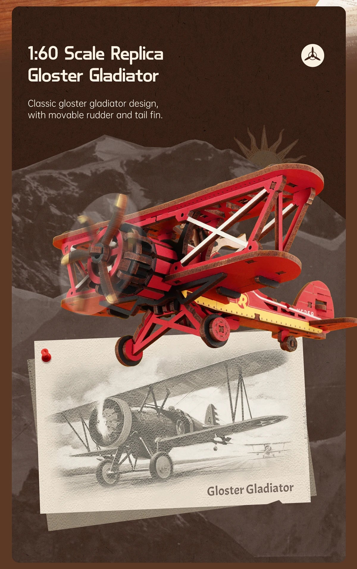 Inspired by the classic Gladiator fighter plane, this model showcases a vintage European aesthetic with a sophisticated four-tone color scheme. As the pendulum swings back and forth, it synchronously moves the pilot, bringing the scene to life. The propeller and tail rudder are movable, while the base cleverly conceals a mini storage compartment and a functional compass. With its simple assembly process, this model offers a stress-relieving experience and serves as an elegant home décor piece that adds a touch of nostalgia and charm.