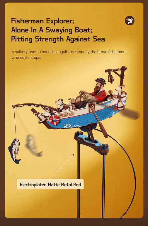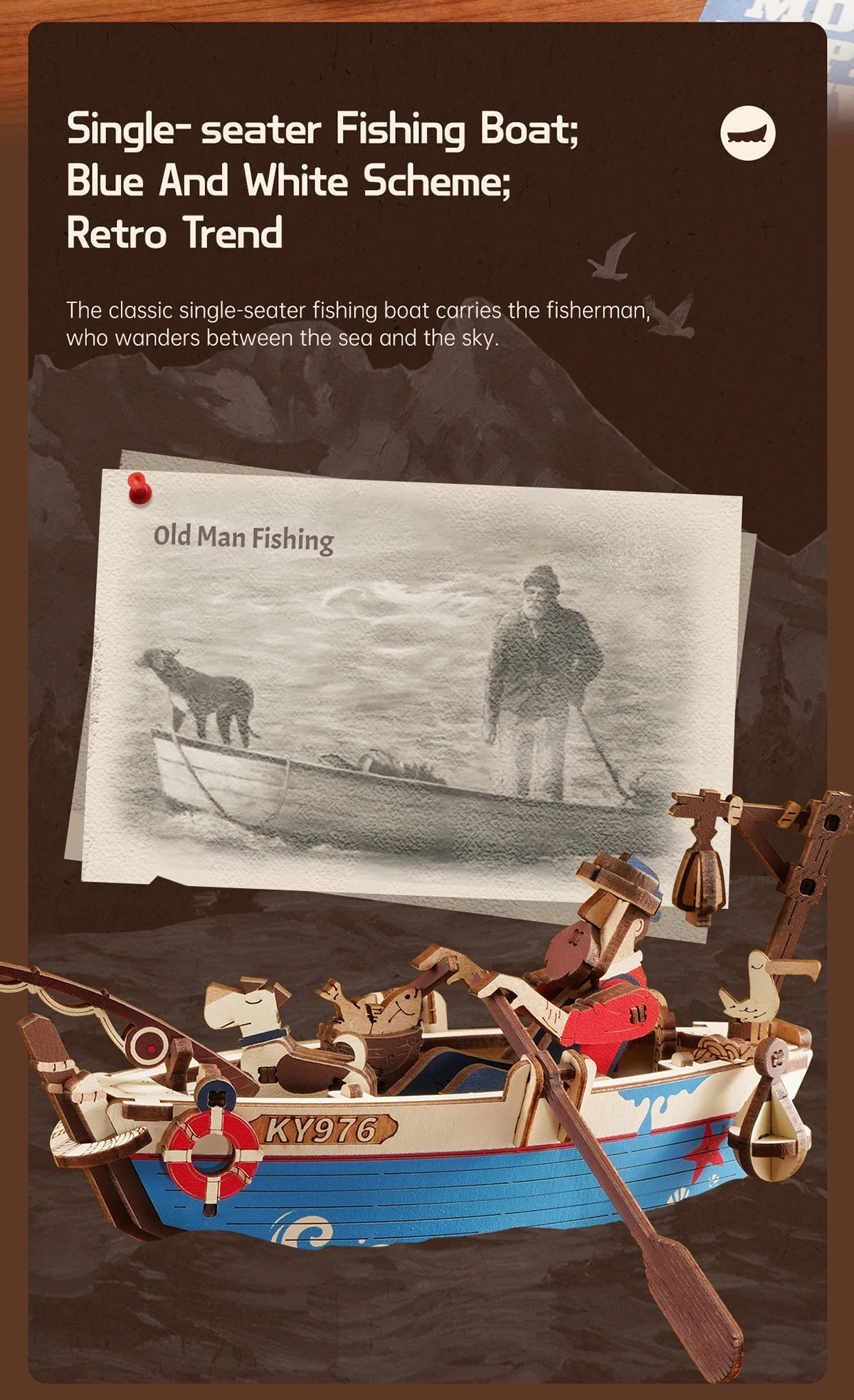 This model portrays a lone explorer venturing into the unknown depths of the ocean aboard a small fishing boat. Featuring a classic blue-and-white color scheme, the boat is equipped with a lantern, a loyal dog companion, and a fish basket. With a nudge, the gravity hammer swings, setting the oars into a rhythmic motion—one moving forward, the other backward. At the same time, the extended fishing rod tugs at a fish, evoking the intense moment of a fisherman wrestling with the sea. This dynamic display captures the thrill of maritime adventure while serving as a soothing and captivating home accent.