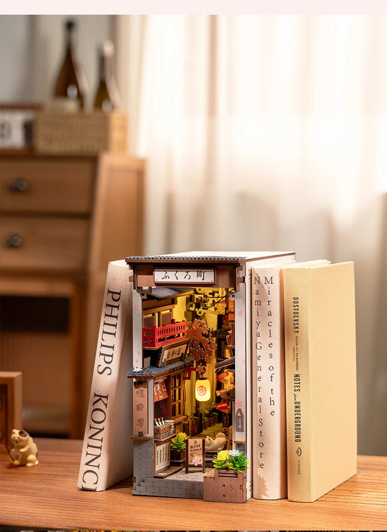 Robotime Rolife Sakura Wine Alley Japanese Style Design Book Nooks Kit for Family Home Bookshelf Decoration 3D DIY Wooden Puzzle