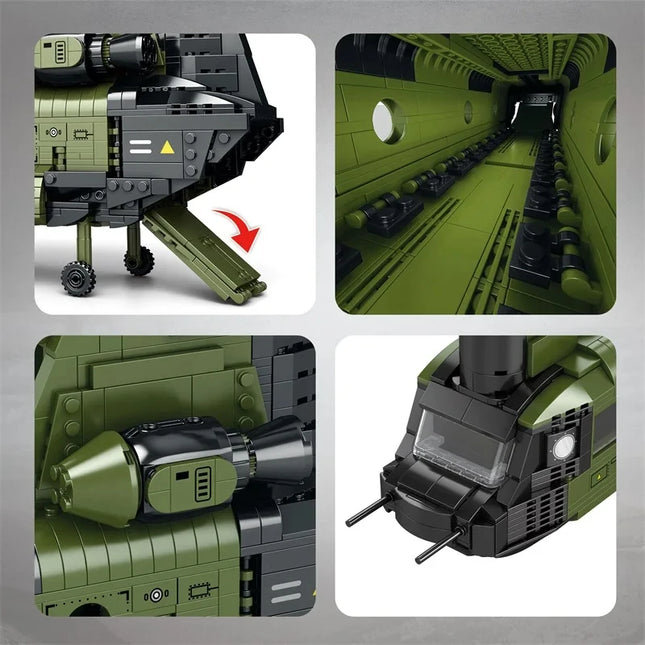 1. Dual-Engine, Twin-Propeller Design: This 1622PCS CH-47 Chinook Transport Plane Building Blocks set showcases an authentic replica of a medium-sized transport helicopter with its distinctive dual-engine and twin-propeller configuration. Immerse yourself in the world of military aviation with this highly detailed model.