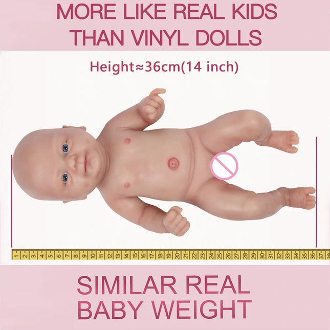 A: This reborn baby is made of Platinum Liquid Silicone, it is soft and Weighted Body for a "Real" Baby Feel.