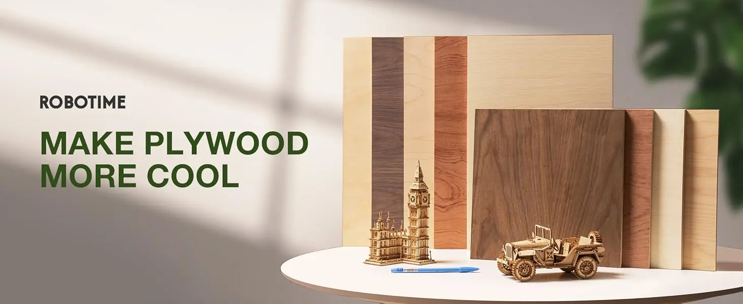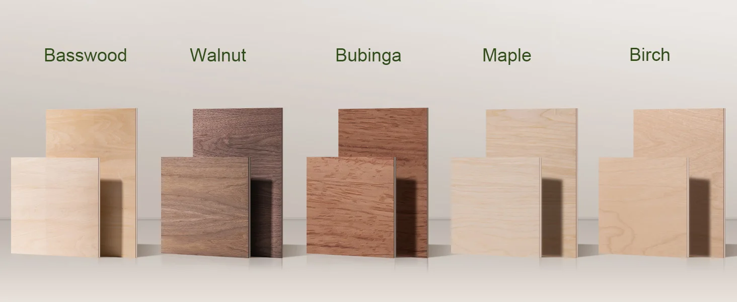 ROBOTIME offers a premium range of laser-ready plywood, crafted from a curated selection of fine woods including Basswood, Colored Basswood, Maple, Bubinga, Walnut, and Birch. Each species is chosen for its compatibility with CO₂ laser cutters and engravers—ensuring clean cuts, detailed etching, and consistent performance for a variety of creative and professional applications.