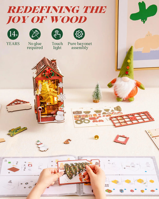 CHARMING CHRISTMAS COTTAGE - This enchanting book nook replicates a cozy Nordic-style Christmas cottage, adorned with festive wreaths, bells, and delicate snowflakes. The transparent PET roof and windows create an inviting, open feel, making it a perfect festive accent for your home.