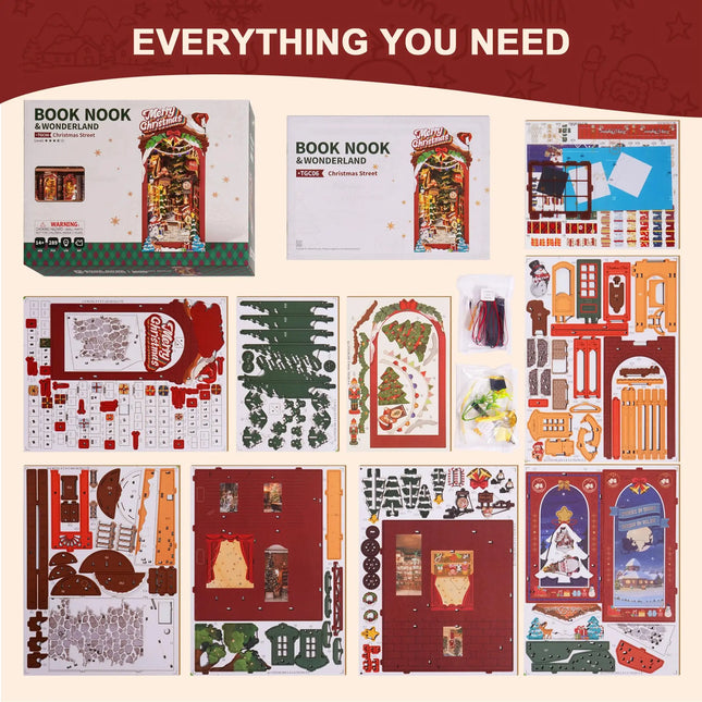 CHRISTMAS VILLAGE STREET SCENE - Inspired by the charm of a festive European town on Christmas Eve, this book nook recreates the lively and warm atmosphere of the holiday season. With its intricate details and soft lighting, it turns any bookshelf into a magical, storybook scene filled with Christmas cheer.