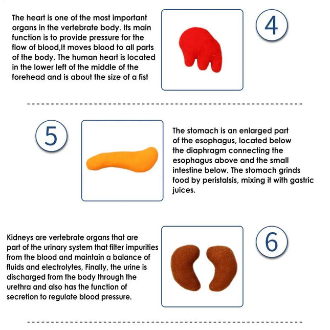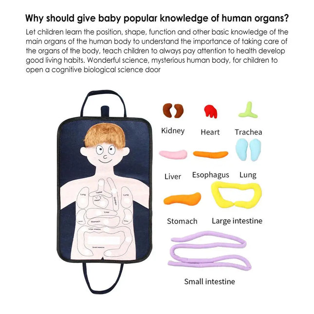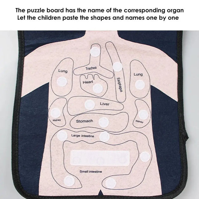 This early childhood education body organ identification toy has bright colors, soft and warm material and reasonable design, which is conducive to children's identification of human body organs and their body structure.