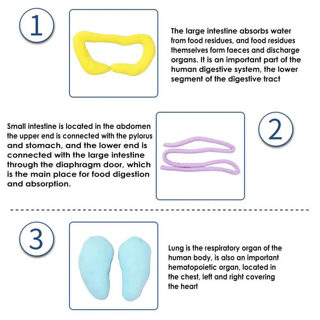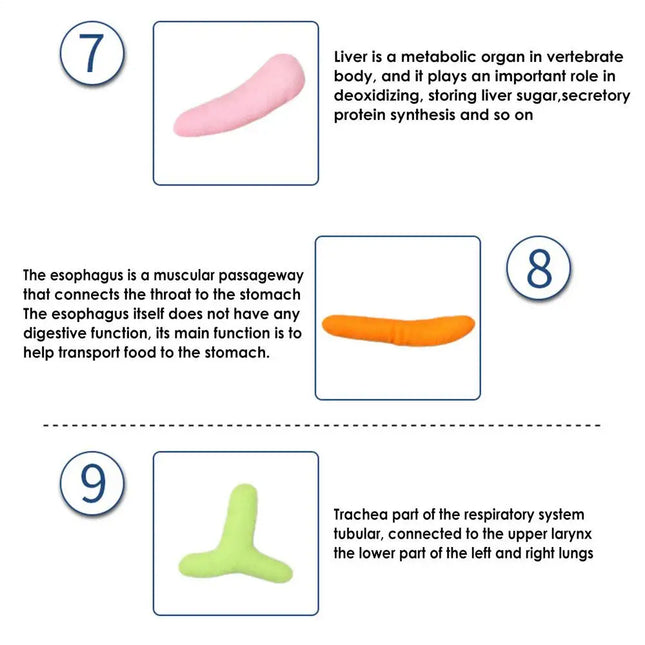 4.Cognitive Body Structure: This human body organ structure learning toy can help children accurately recognize their body organs including their shape, position and size. There are complete small toys for human body organs, including kidneys, heart, large intestine, trachea, liver, esophagus, lungs, stomach, large intestine and small intestine. This can help children accurately understand their body organs including their shape, location and size.