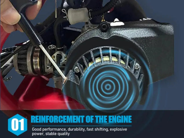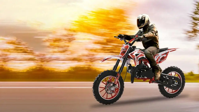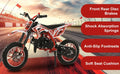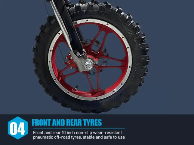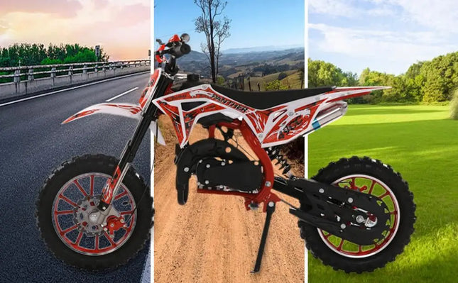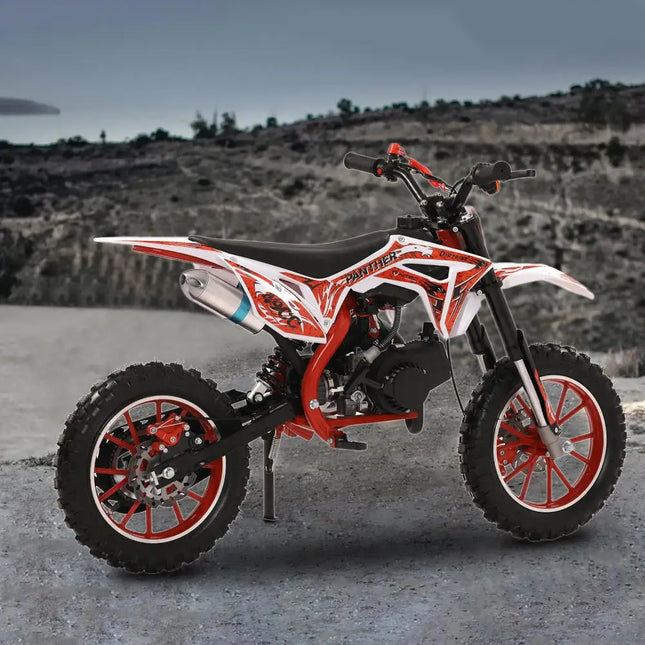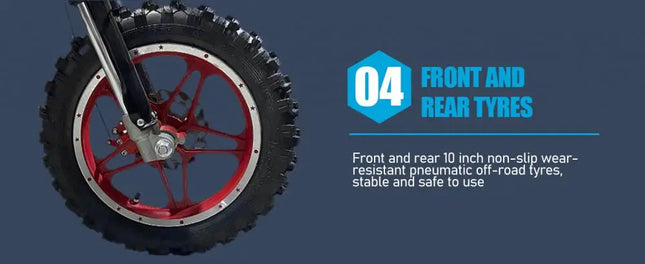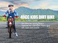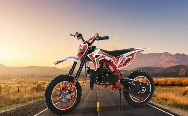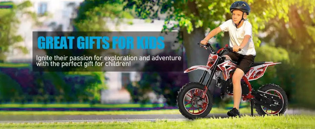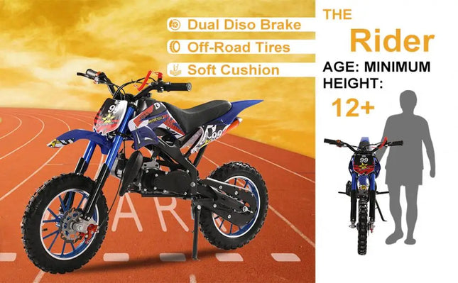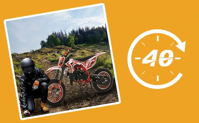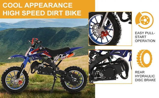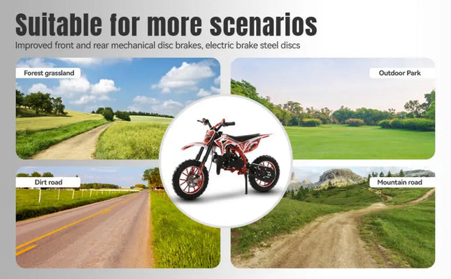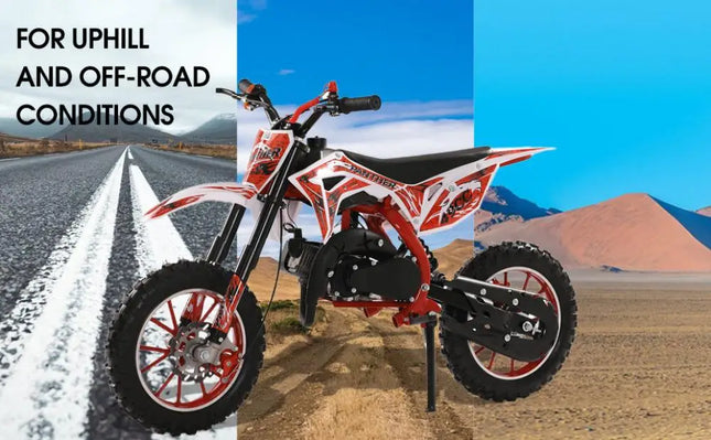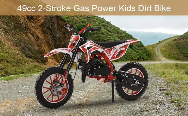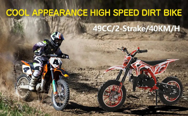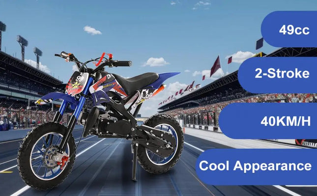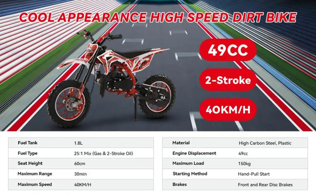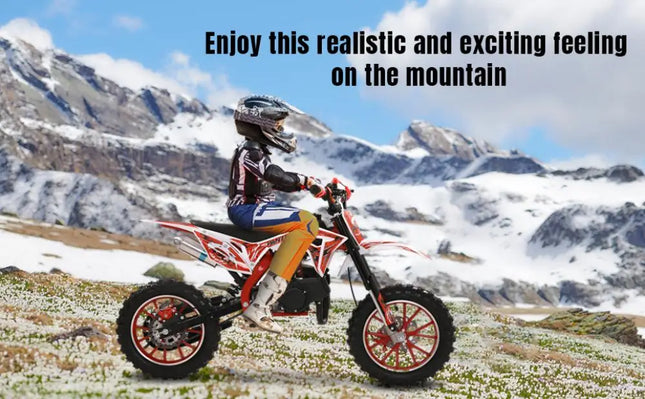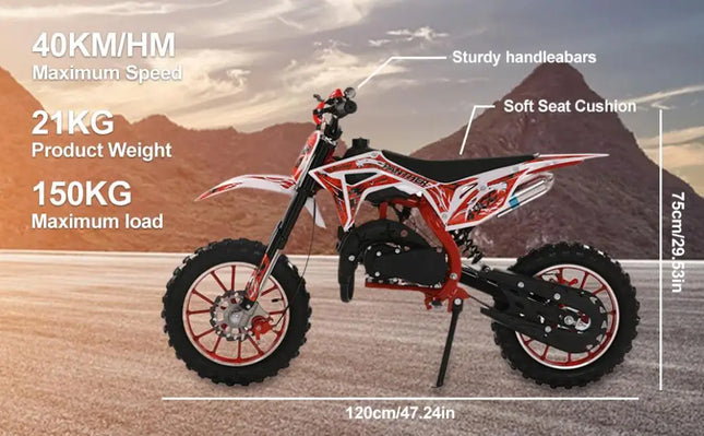49cc 2-Stroke Engine: With a 49cc 2-stroke engine, kids mini motorcycle can reach a max speed of 40KM/H, so your kid will enjoy this realistic and exciting feeling on mountain.