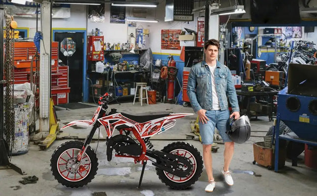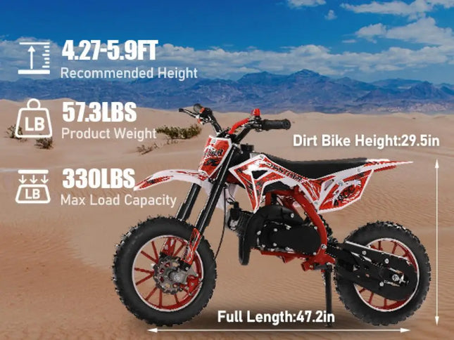 Dimension: The 49cc mini motocross is powered by gas and 2-stroke oil, measured 47.2 inches length and 29.5 inches high. Get this pocket motorcycle to be an irreplaceable partner for your kid with childhood memories.