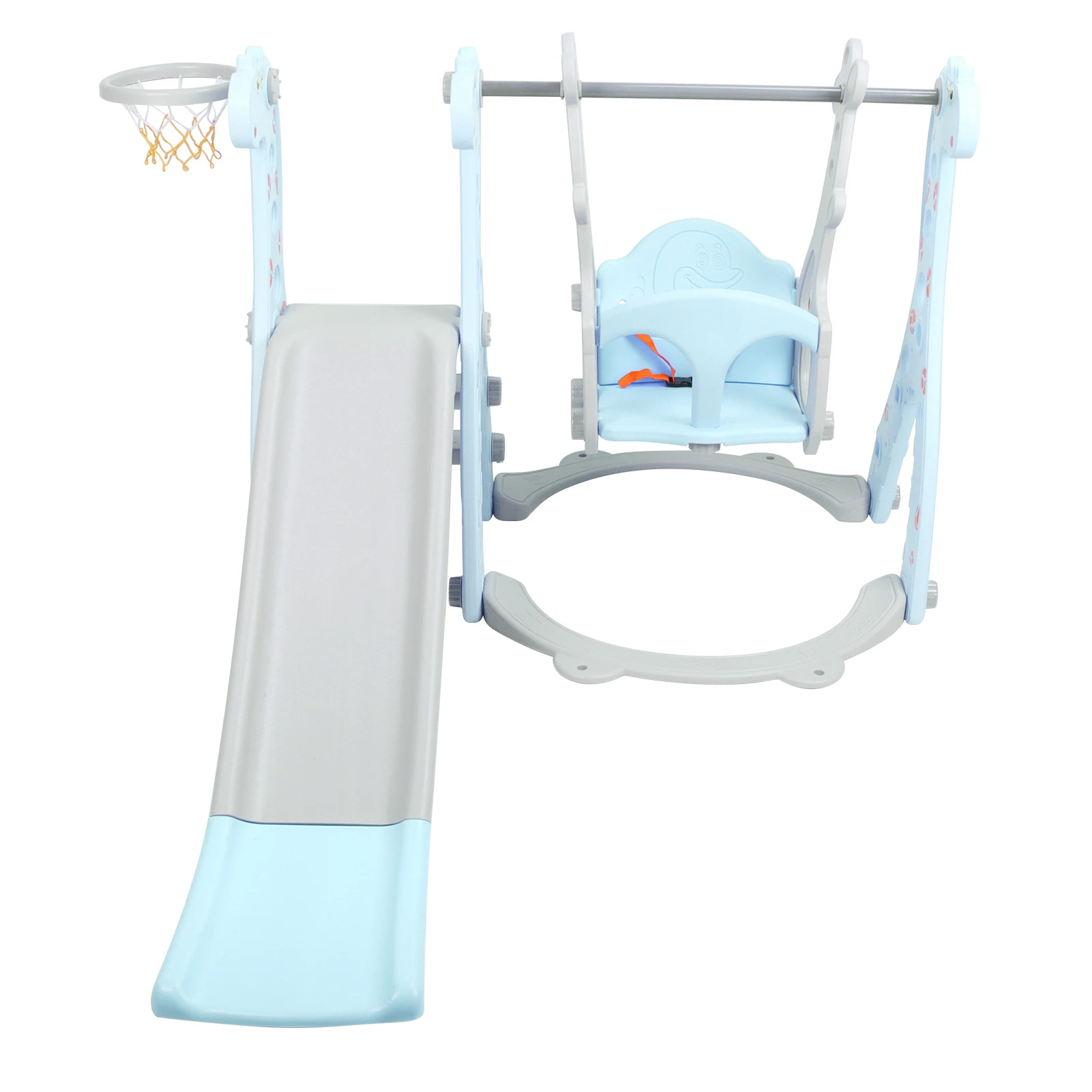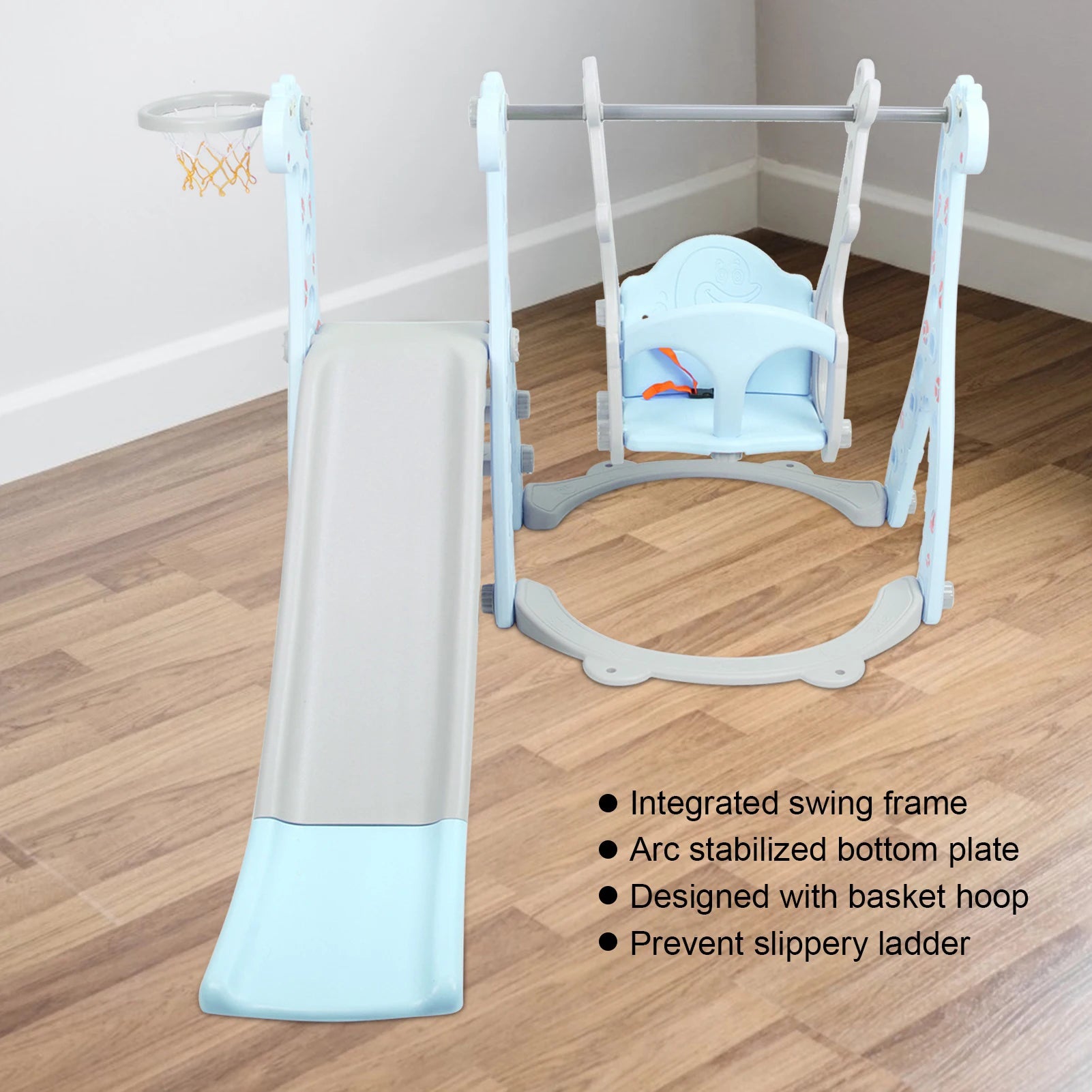 1. Thick slide plate, intended for indoor and outdoor use, can develop kids' hand‑eye coordination ability and balance ability.2. Integrated swing frame, increases the cushioning force in the slide and prevents the kid from being hurt when rushing out of the slide.
