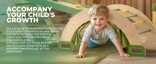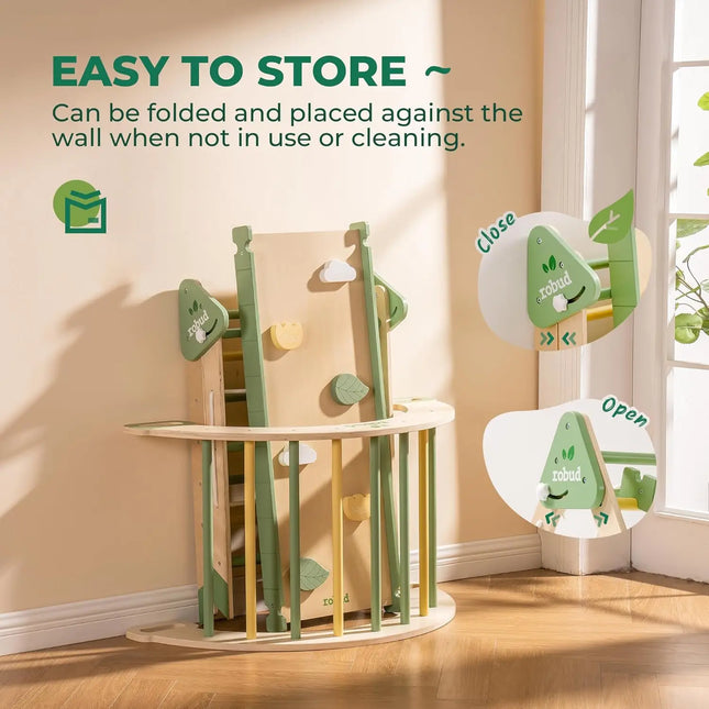 RELIABLE & CHILD-FRIENDLY DESIGN – Crafted from premium solid wood with smooth, rounded edges, the ROBUD 7-in-1 Wooden Climbing Set ensures both durability and safety. Thoughtfully designed for little explorers, every detail is built to provide a secure and worry-free playtime experience.