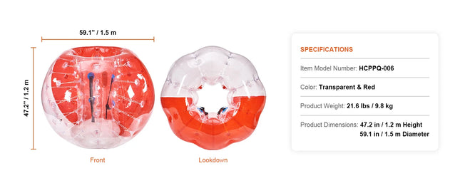 Designed for quick and simple wear, these 5FT bumper balls are perfect for outdoor games. Suitable for players between 4.9 ft and 6 ft tall, weighing 110 to 330 pounds, they are ideal for both teenagers and adults!
