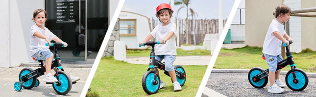 Easy to Set-up for Different Modes: This 4-in-1 toddler kids training bike could switches easily among balance bike with training wheel, classic balance bike, riding tricycle and kids pedal bike. Thanks to the red push button design, handlebar, pedals and training wheels could be removed / assembled easily without any tool required.