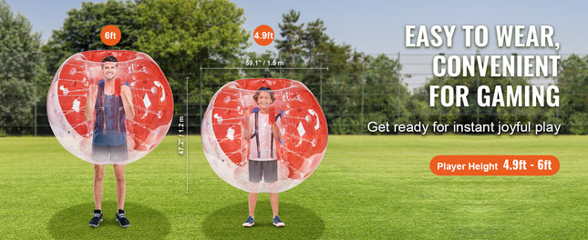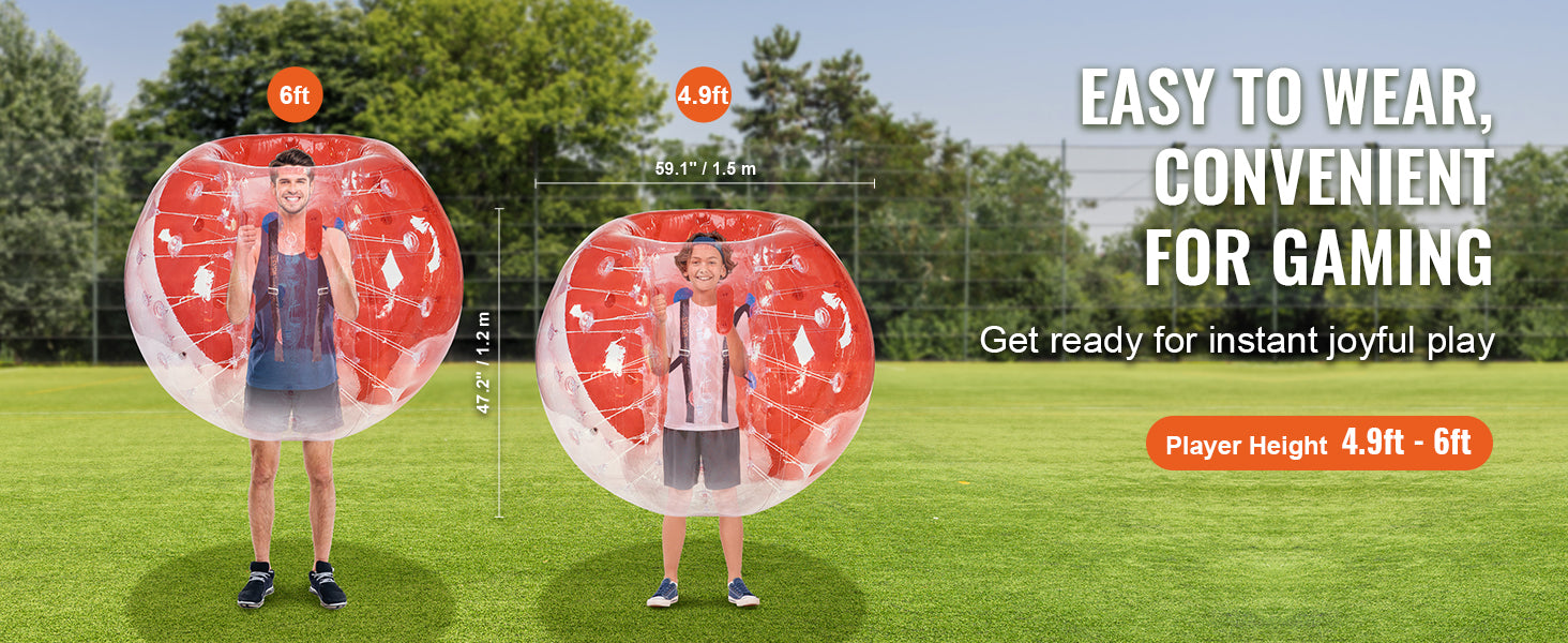 Easy to Wear, Ready for Play: Our easy-to-wear body sumo zorb balls are perfect for outdoor team gaming play. With 5FT outer diameter, they're recommended for players 4.9 ft to 6 ft tall and weighing 110 to 330 pounds, especially suited for both teenagers and adults.