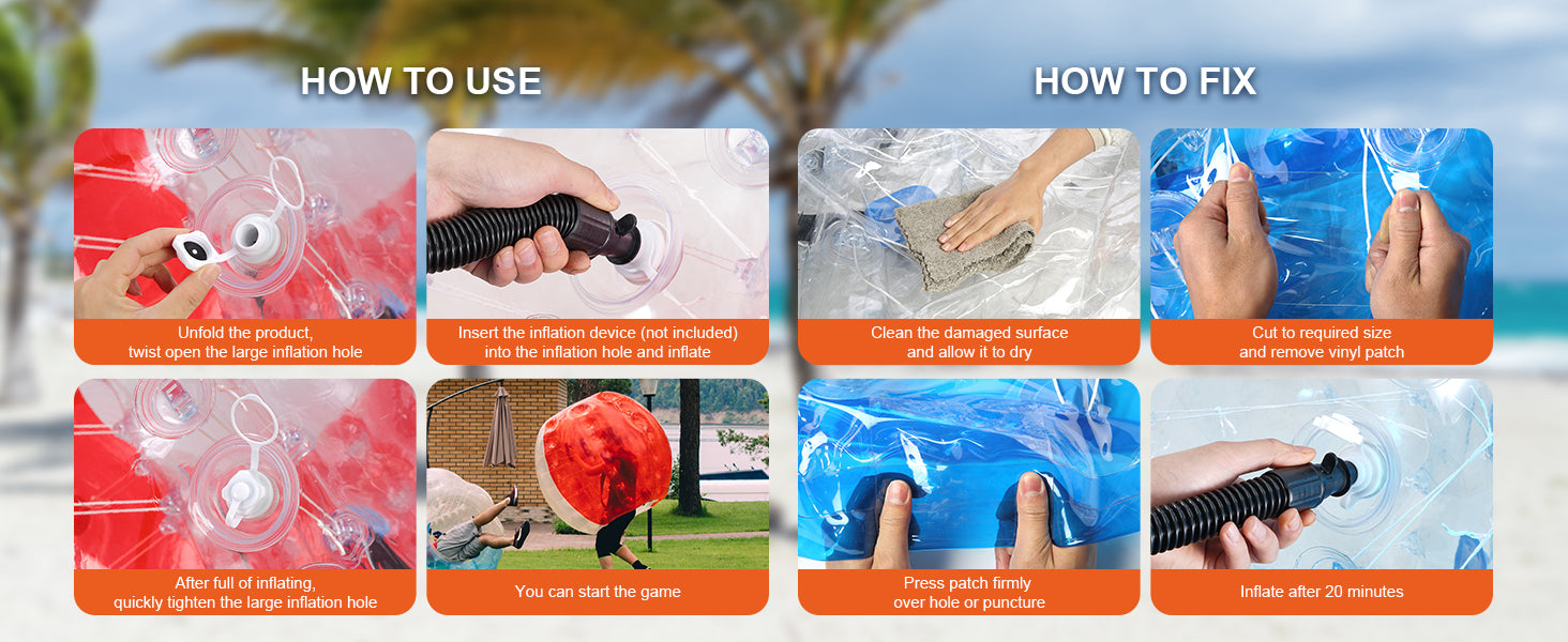 Keep the Fun Going: Our thoughtful repair kit includes necessary part you need to patch balls up and get back to the fun. With easy-to-follow instruction and 2 repair patches, each capable of fixing 1-3 small holes, the good bumping times can keep lasting for years. ( PLEASE NOTE: One inflation can last for about 12 hours. Please inflate it again before using it next time.)