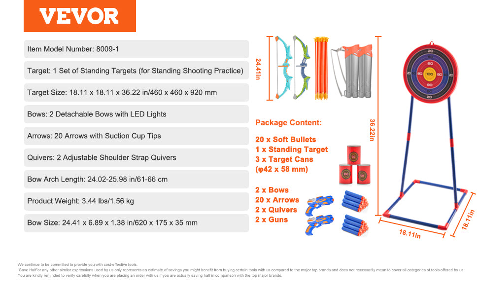 Comprehensive Entertainment Solution: Made with top-quality, durable materials, our kids bow and arrow set is built to last through all your outdoor adventures. Inside, you'll find 2 bows with cool lights, 20 arrows, 2 quivers, 2 guns, 20 soft bullets, 1 standing target, and 3 target cans. It's all about endless laughs and good times, perfect for every family outing! (Batteries not included.)