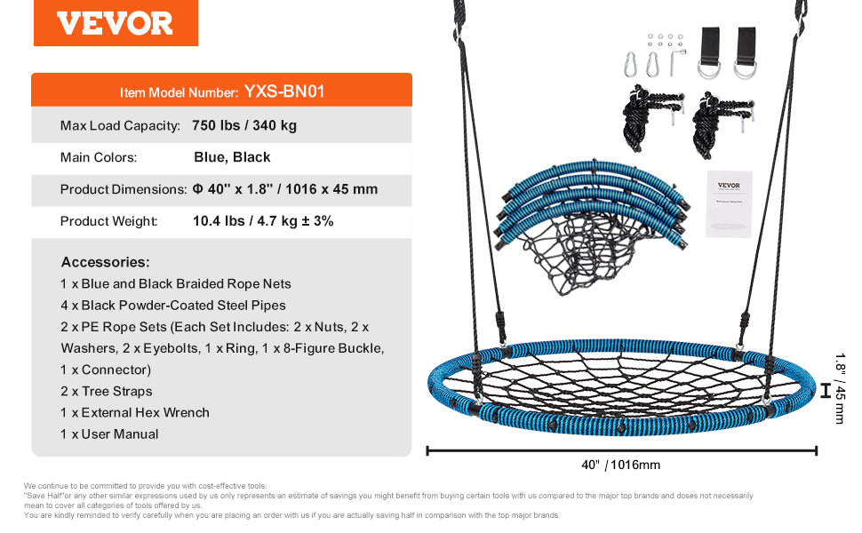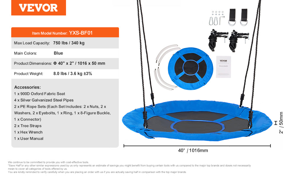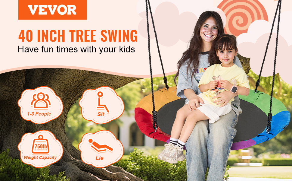 40" Large Tree Swing: The 40" saucer tree swing provides exciting and fun playtime for your children. It has enough space to accommodate 1-3 kids or adults playing together, supporting up to 750 lbs. Children can also safely lie on the swing and enjoy the beautiful outdoor scenery.