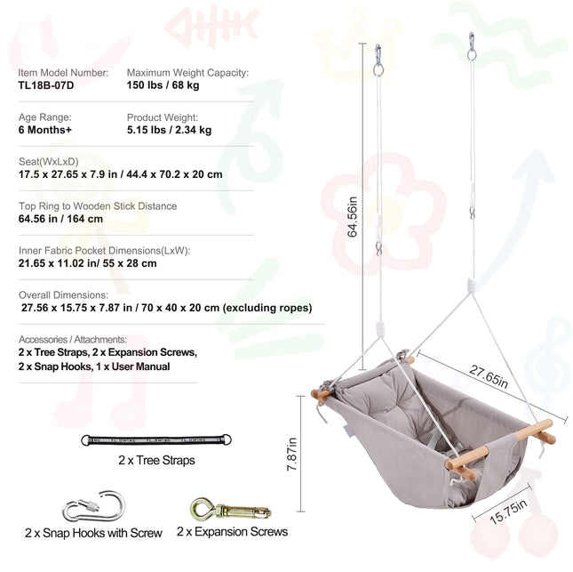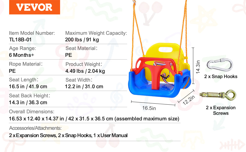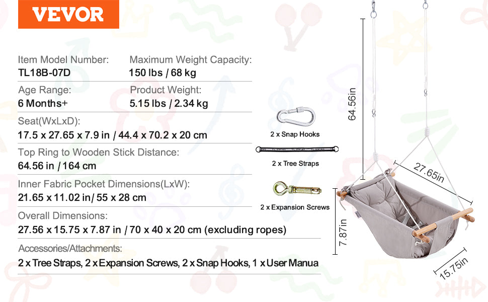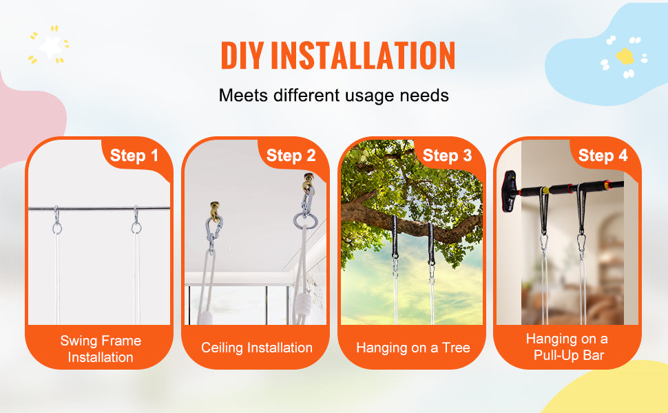 Always Safe Hanging: The ropes of the tree swing for kids are upgraded to multi-strand braided high-strength PE ropes, which are soft, flexible, and resistant to knotting. They do not easily age or deteriorate even after long exposure to outdoor elements. The rope ends are reinforced to prevent fraying. Plus, The adjustable rope length allows a vertical height adjustment of 4.6 ft-6 ft / 1.4 m-1.8 m, suitable for most hanging heights.