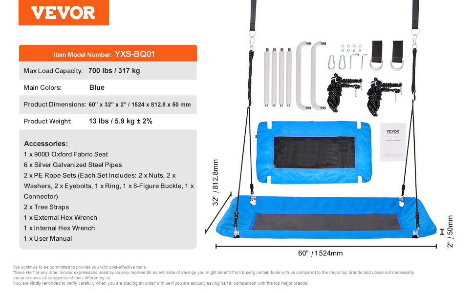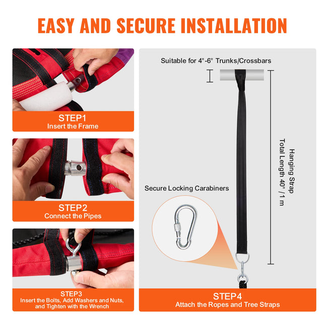 900D Multicolor Oxford Fabric: The rainbow-colored swing seat is made of 900D high-density nylon fabric. This durable material is strong and can withstand everyday use and outdoor wear and tear, offering a long lifespan without fading. The frame tubes are made of galvanized steel with a soft foam layer, ensuring comfort and safety for children. The saucer swing seat is secured with four evenly stressed galvanized steel bolts that resist rust and keep the swing stable.