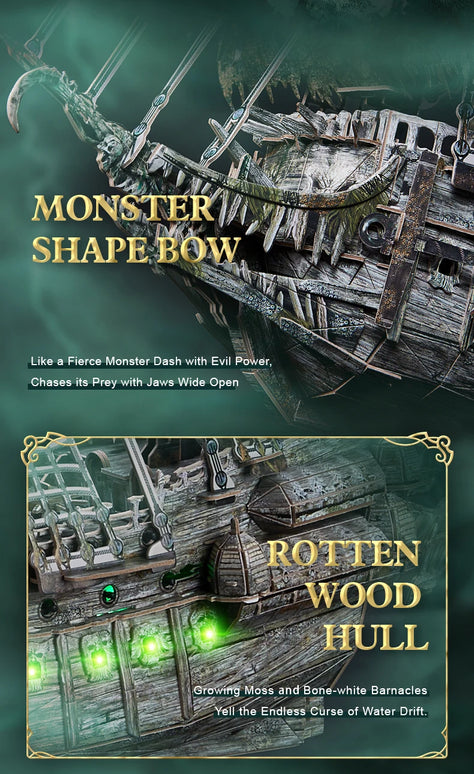 A unique bowsprit design that consists of skeleton statues and crafted detailed ornaments. The monster shape bow and the rotten wooden hull make this magnificent Flying Dutchman.