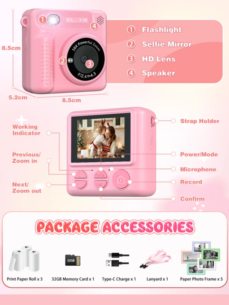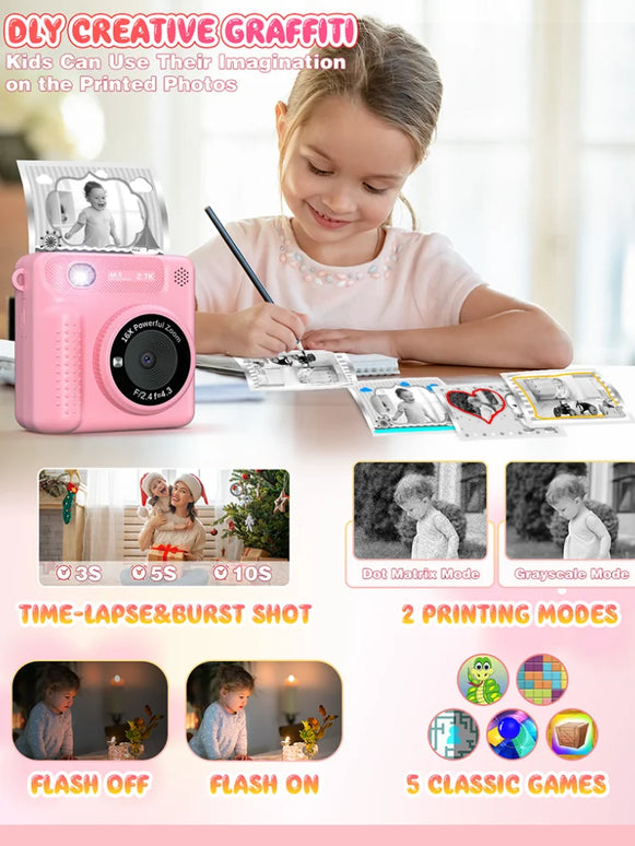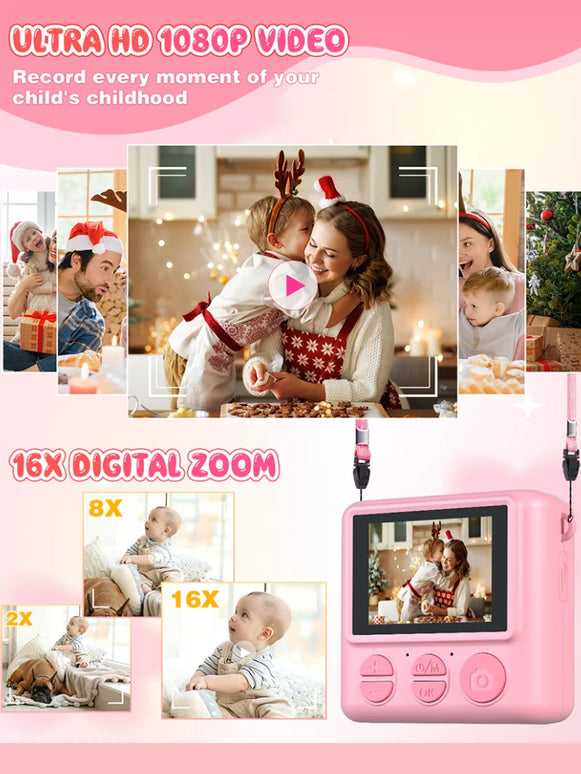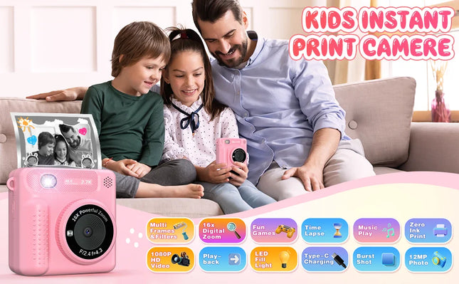Kids Camera Instant Print 12MP 1080P Digital Camera Toddler HD Video Camera Print Photo Portable Toy Age 3+ Girl Christmas Gift