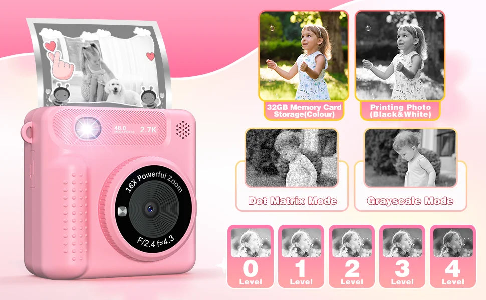 š·ćMultifunctional Digital CameraćThis kids digital camera with an instant printing function can have a black & white paper photo only 1 second after pressing the shutter. At the same time, you can get color photos to store on the memory card. Our camera has 5 color filters, 9 funny stickers, 8 mirror effects & 5 different printing densities (0-4). There are 3 volumes of printing paper, which can print 300 photos. Children can take interesting pictures and doodle pictures to stimulate imagination