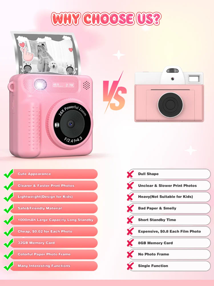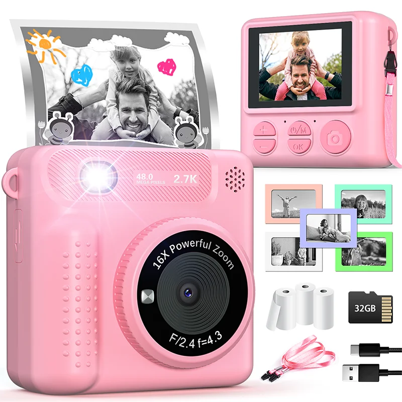 š·ćSafe Thermal TechćInstead of using ink cartridges, this instant camera uses thermal paper that costs only $0.02 per photo paper. Cheap paper rolls allow kids to take photos as they want, they can share printed photos immediately with friends, and stick them to their books to create a physical record of their memories. This kids camera is larger and specially designed for children, the same size as a mobile phone, easy for children to hold and drop-proof.