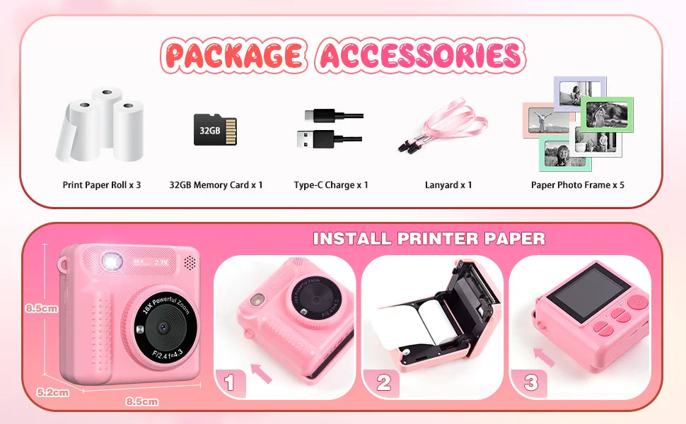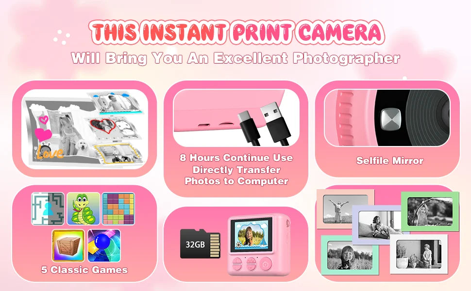 š·ćType-C Charging & USB TransferćOur upgrade camera comes with a type-c cable that can not only fast charge kids toys camera but also can transfer photos and videos to your computer. This camera has pre-installed 32GB memory card in the camera and allows storing thousands of photos on memory card that gives you a digital copy if the printed version gets damaged or lost. Five beautiful colorful photo frames are included to preserve children's precious works. Little photographers will capture beauty in life, animals, foods, landscapes and print photo freely.