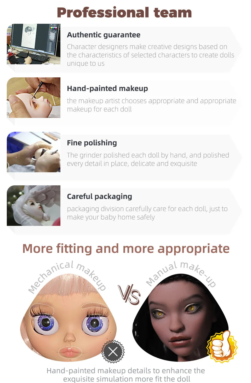 1. Strength team: focusing on BJD doll for more than 10 years, integrating r&d, design, production and sales; Owns the original senior painter, modelers, dresser, make-up artist, from the creation, design, to mold, molding, grinding, makeup, and then to apparel design and production of up to hundreds of working procedure, such as sewing, modelling all completed by experienced craftsmen, presented to your BJD doll each style is unique and highly aesthetic value of art.